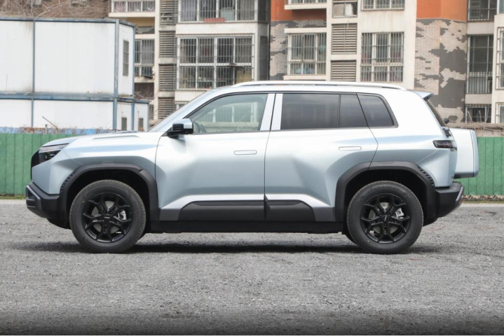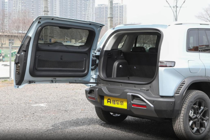 车身侧面是很舒服的方盒子硬派风格,线条平直有力,外扩的轮眉看着就很有肌肉感,再加上隐藏式门把手,侧面干净利落,风阻也更低。除此之外,车尾采用了侧开尾门+外挂小书包,特别有个性。这个小书包还是实用的储物盒,放充电枪、小工具刚刚好。尾灯是横向切割样式,点亮之后很醒目,整体看着敦实又好看。