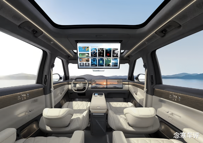 拉开车门坐进去,那种熟悉的德系保守感荡然无存。环抱式座舱直接安排上双15.6英寸联屏,后排更是夸张,车顶直接挂了一个21.4英寸的娱乐大屏。